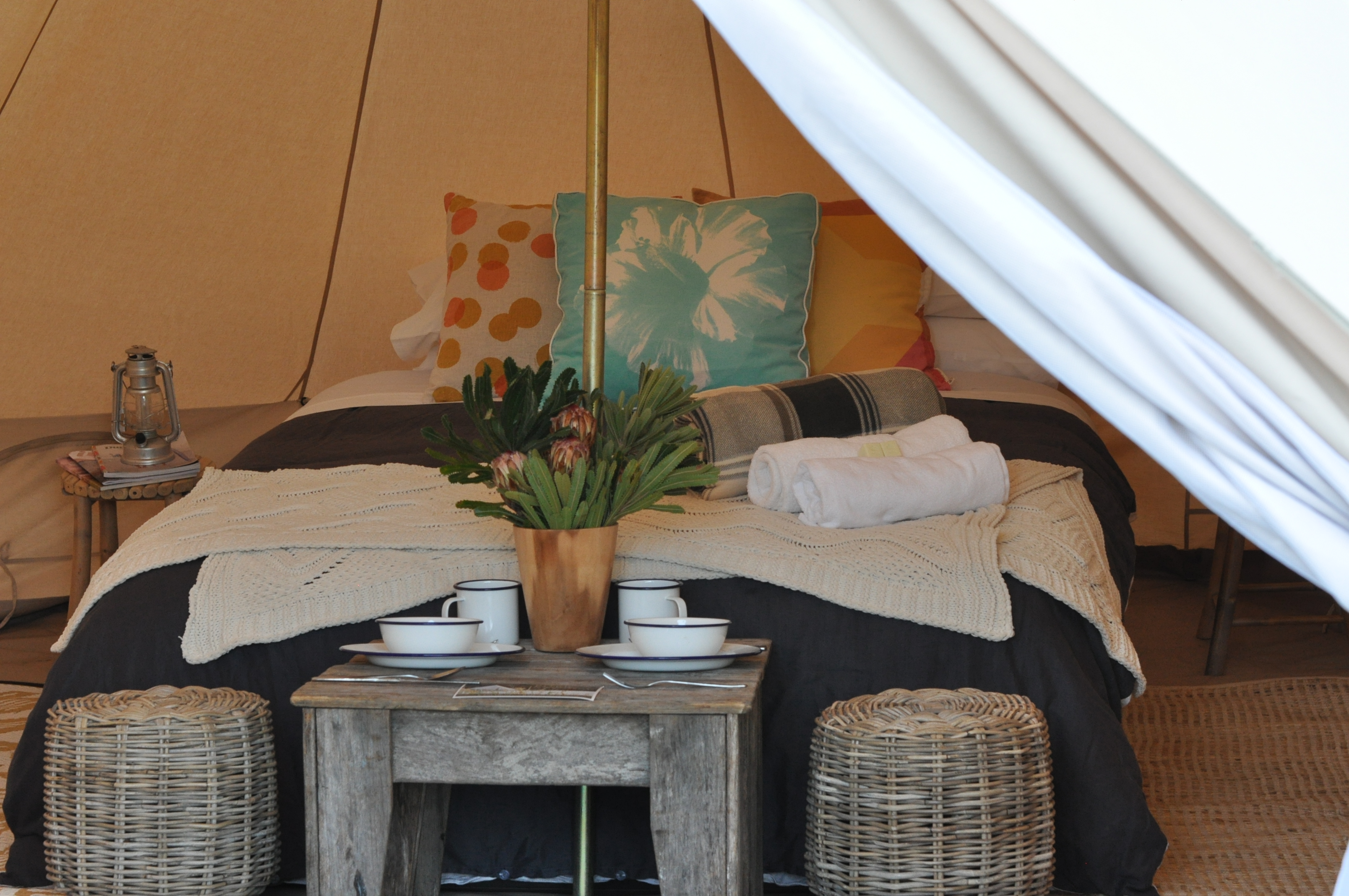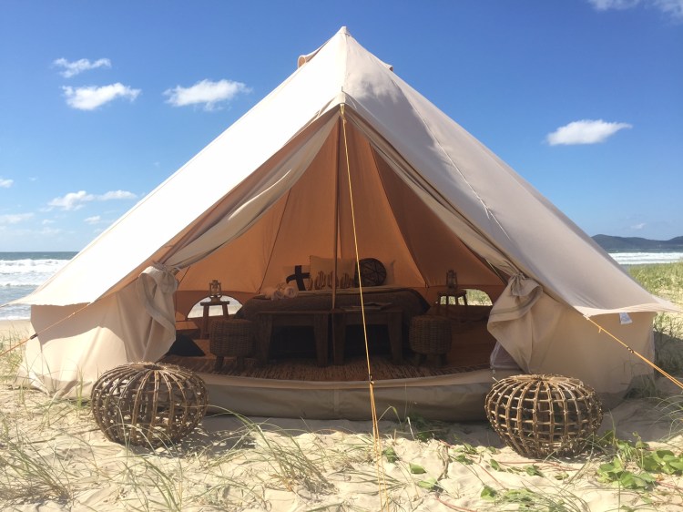 Our fully furnished 5 metre deluxe Bell tent comes with queen bedding, linen, towels, lighting and furnishings included, set up by our team and ready for you to enjoy. We have lots of options for locations you can choose from. Choose beach or bush, book the site and then we will come and Pitch it for you. We also have gourmet food hampers available on request from Apple Pip Catering
